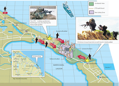 Troops of 53 and 58 Divisions since Wednesday (May 13) started manoeuvring southwards along the western and eastern borders of the newly declared civilian safety zone (CSZ) in order to keep the terrorists engaged on the northern frontage. The 53 Division marched along the bank of the Nanthikadal lagoon whereas the 58 Division crossed the open coastal terrain amid heavy LTTE shelling and machine gun fire. The manoeuvre became a success, as the hostages in large numbers have been able to find their way to the government controlled areas across the southern frontage.