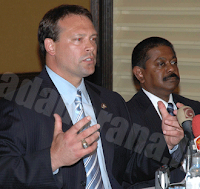 The visiting US Congressman Heath Shuler is pictured here speaking to media in Colombo today. He said that he has seen the standards of relief villages where the Internally Displaced are accommodated and it is different to what had been reported in the US.