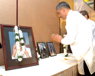 General Sarath Fonseka (Retd,) on Friday garlanded a photograph of slain newspaper editor Lasantha Wickremetunge, and paid his respects (above). He was addressing lawyers of the National Lawyers Association as common candidate of the opposition, along with UNP leader Ranil Wickremesinghe.